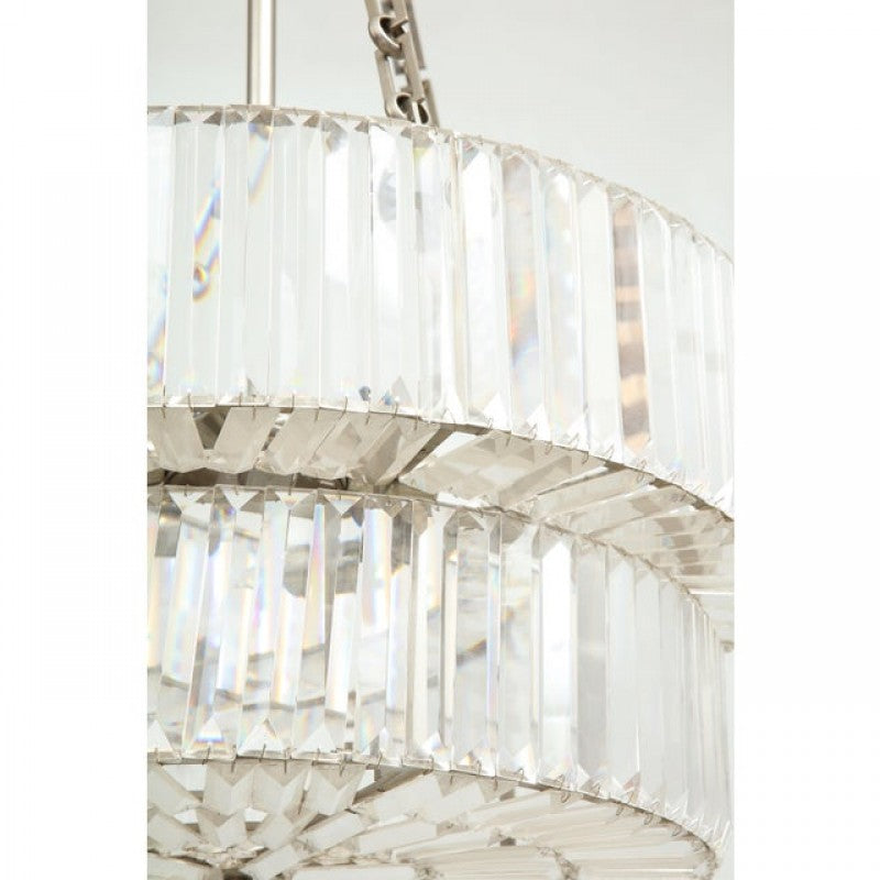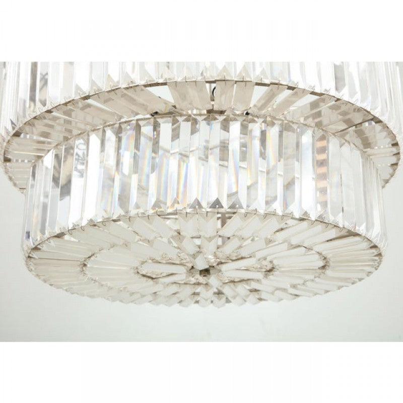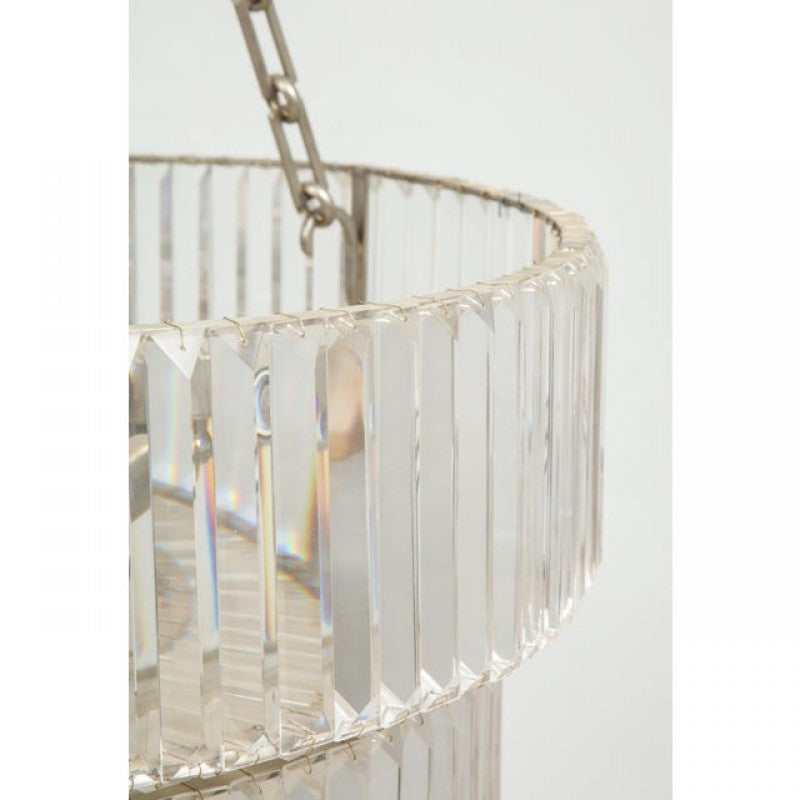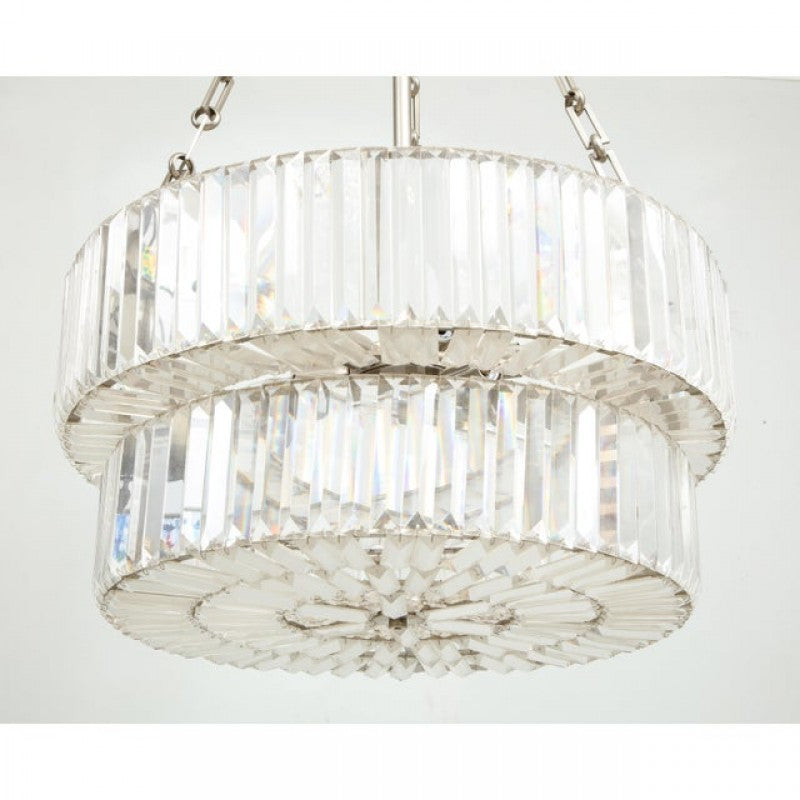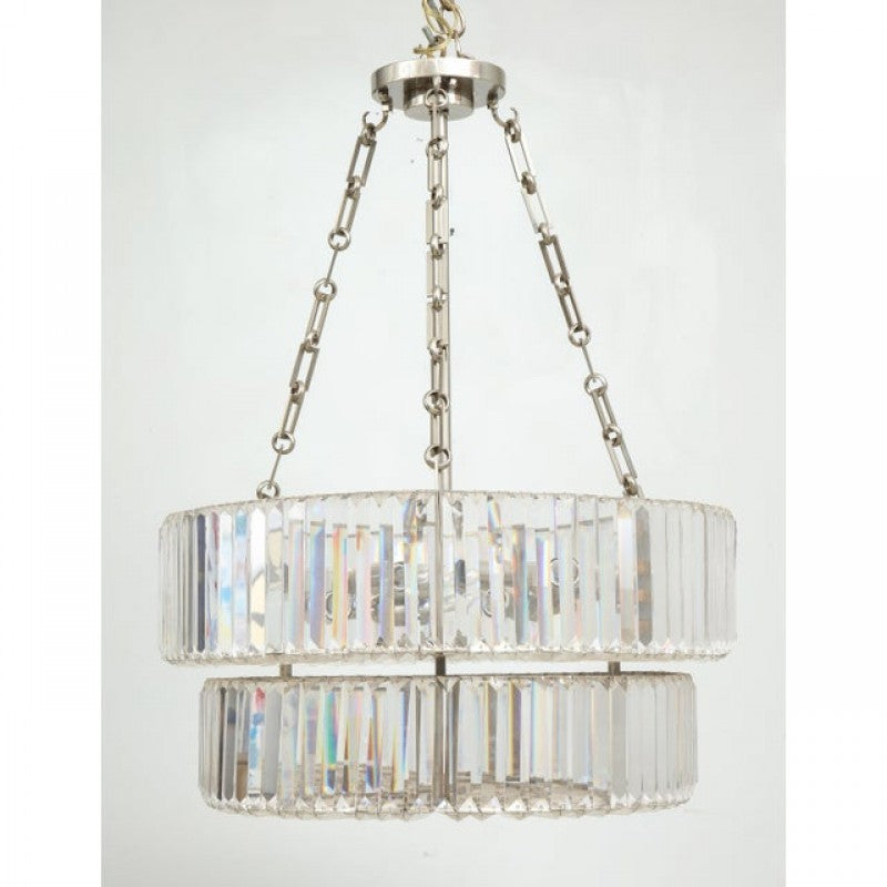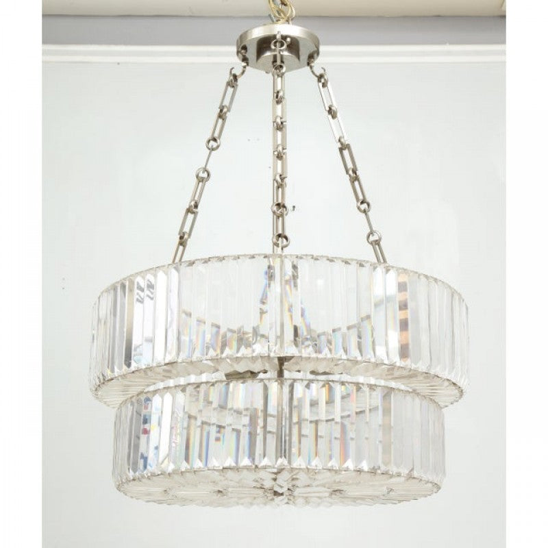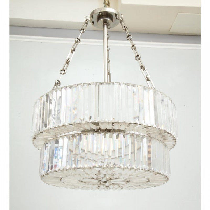 Inspired by a German chandelier from the 1970s, our fixture evokes the boldness and glamour of the era. A band of faceted crystal glass prisms reflects and refracts the light, capturing the essence of crystal. Because our lighting is made by a workforce that still relies on traditional working methods, each product is unique and carries with it the sensitivity of the artisan. Having created custom chandeliers for over three decades, we specialize in bringing lighting concepts into reality, whether your inspiration comes from a rough sketch, an existing chandelier, our original concepts, or even your own creative imagination. Large or small, our team can meet the challenge, and can even coordinate the production of a private collection, where all finishes are kept consistent. Let us create the perfect lighting fixtures for your individual needs, to your individual specifications, and with attention to detail throughout production.