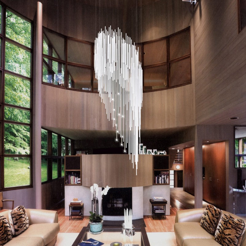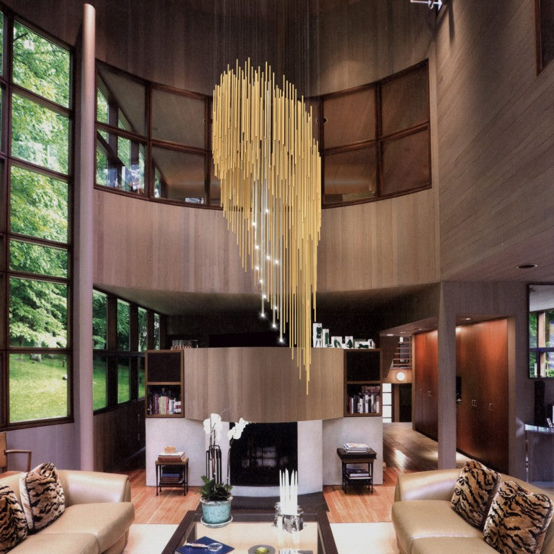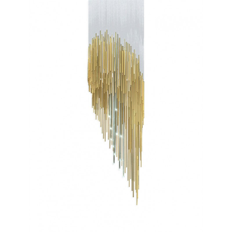 This dramatic lighting looks like the visual equivalent of a grand classical symphony, splashing down from above in precise yet relaxed strands. Each vertical hanging line of this gorgeous piece is composed of either satin-polished brass or powder coat aluminum depending on taste, each material bringing with it its own particular mood. LED bi-pins are suspended unobtrusively throughout, providing a glamorous sparkle perfect for Libretto’s symphonic aspirations. Libretto is best displayed where there is plenty of room to show off its grandeur, such as high-ceilinged lobbies, however it can also be customized in size to suit individual requirements.
