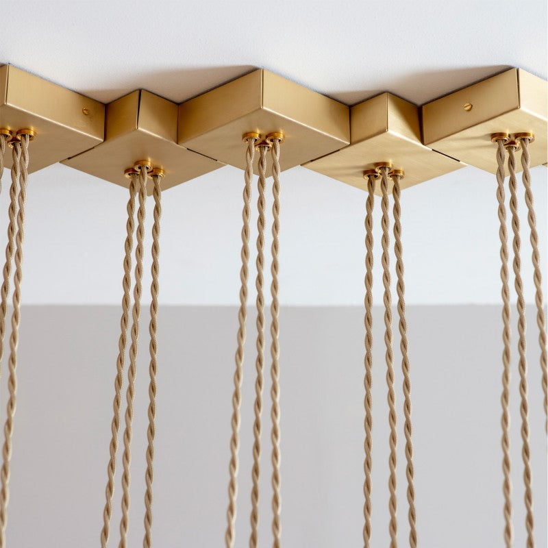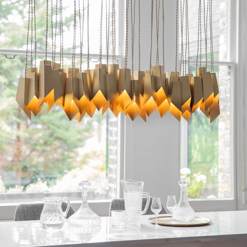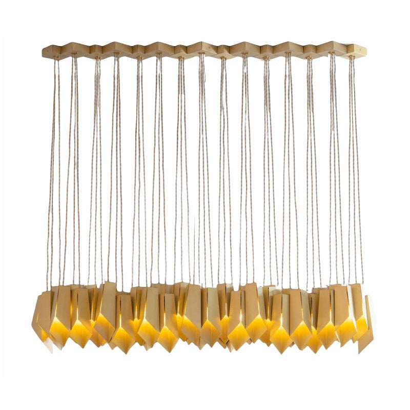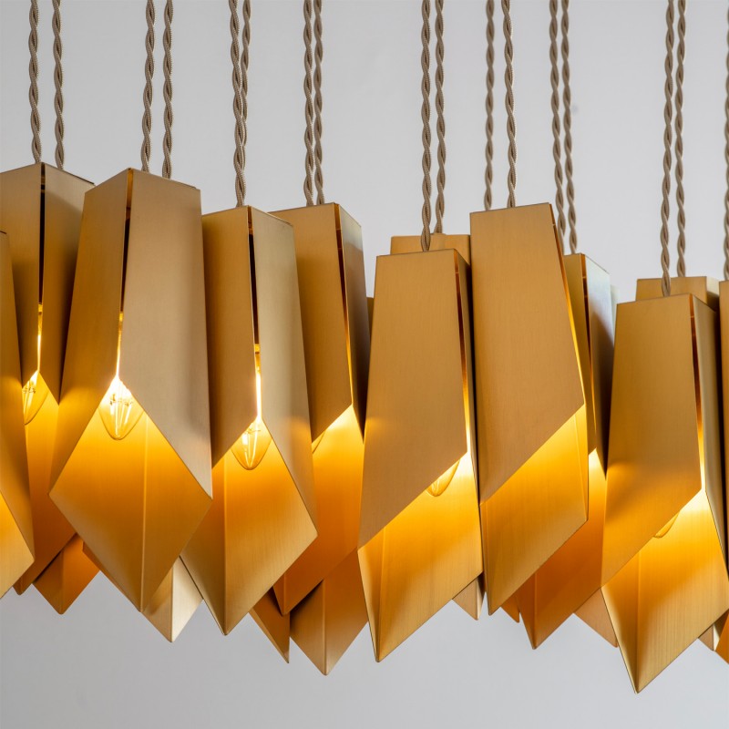 A linear array of folded brass shades, each one hand-grained to bring out the best in this beautiful material. Original One of a Kind Design Chandelier. No two alike, each chandelier in this design is a one of a kind. This hanging light looks interesting from any angle, and makes nice shadows. One of the technically most particular chandeliers created. We approach this sculptural object in a contemporary, unexpected and creative way. Light and shadow interplay and exist together, there is a subtlety of using both to manipulate space and thought.