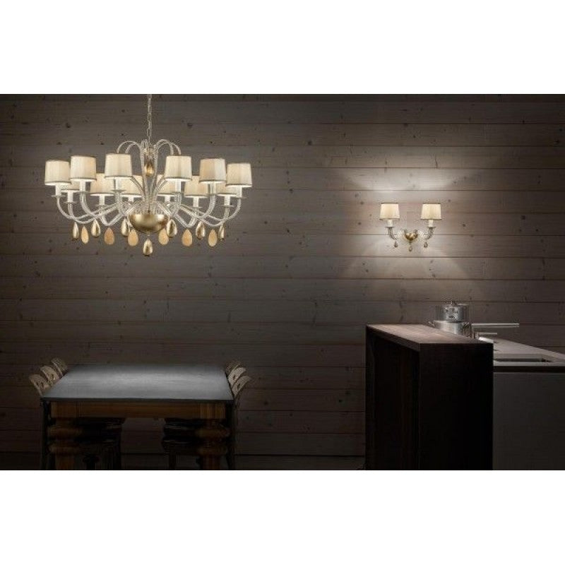 The Noblesse chandelier will create a cozy and fill any space with a special chic atmosphere. Metal frame with an ivory finish, with delicate hand storks of gold, decorated with transparent glass beads. The resin pendants covered with gold leaf and the ivory shantung fabric lampshades complete the play of light and shade. The key to an elegant, opulent, bespoke design understands the aspirations of the client, the relevance of location, and maximizing the potential of the existing elements in the space.