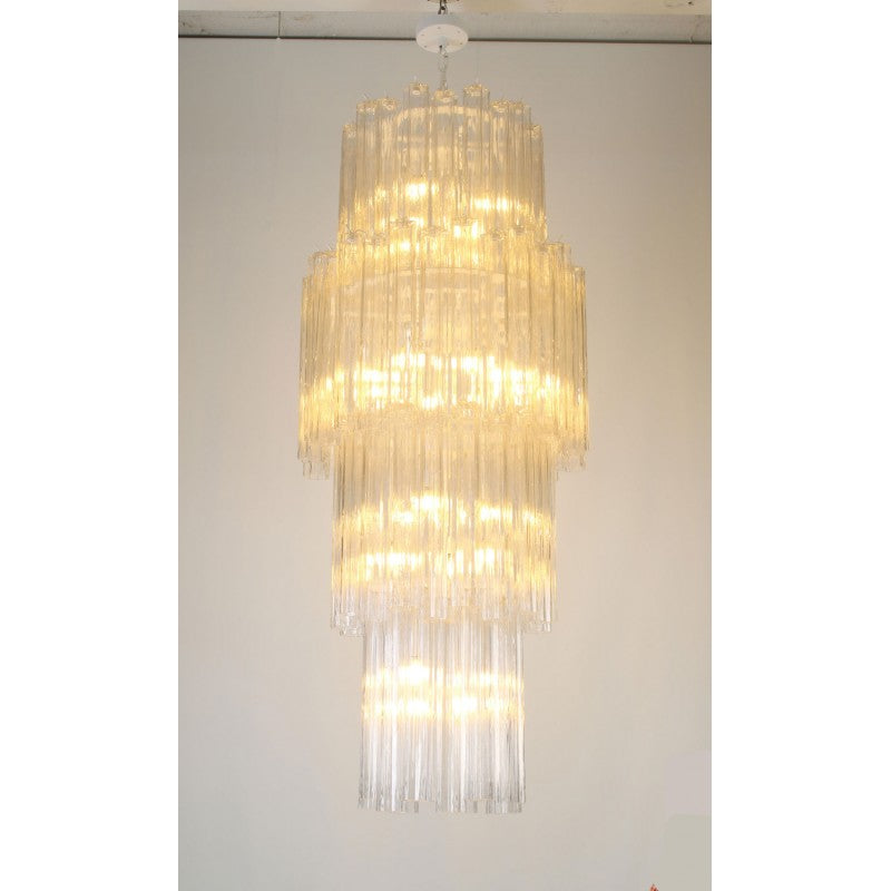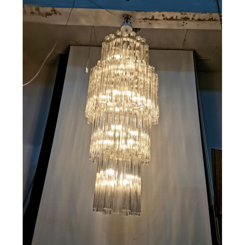This Gorgeous cascading Multi Tiered chandelier made of hand-blown Murano glass pendants is a grand, statement-making piece that is sure to add luxury and class to your space. It’s beautifully shaped Murano Glass Tubes are hand-blown glass that creates a nice graded structure. The chrome frame in original condition shows ware only visible during assembling. It comes with an original chrome link chain and chrome canopy.