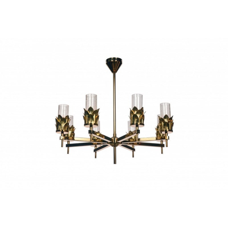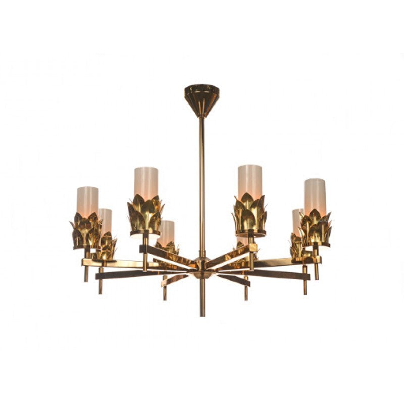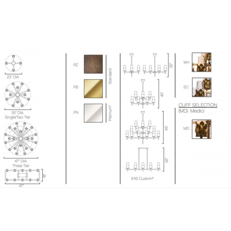 The modernist silhouette of the GIO single or multi-tiered frame juxtaposes with jewelry-inspired cuffs cradling hand blown frosted or seeded glass cylinders. The MEDICI cuff is a layered crown of hand-formed modern acanthus leaves, completing a feature accent that melds architectural lines with an organic flair.
