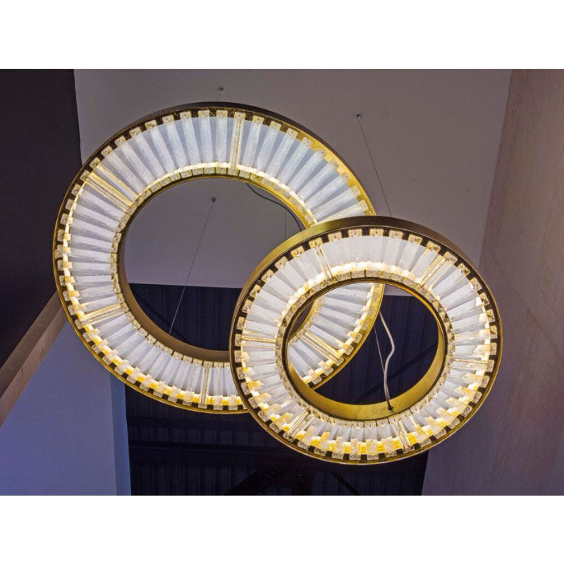 FEATURED: Forged steel rings with different sizes and made to measure tailoring as a high fashion dress. The designer's imagination can count on the size of crystals for exceptional beauty. It’s WATER CRYSTAL that illuminated by indirect light of the LEDs create an unique effect. Crystal effect arises from the experimentation of Marchetti Lab. A special chemical process that traps the water into the crystal, then blown with nitrogen it crystallizes, creating a marvelous effect. DESCRIPTIONS: Collection: Residential Size: 24" Diameter x 3" Height (Custom sizes also available) Shape: Suspension Frame Finish: Satin Gold (Different frame finish available at no additional cost) Materials: Crystal, Brass Weight: 42 lbs Extension: Adjustable chain 12 feet long each (included) Bulbs: Lights, LED Bulbs Assembly: Partly assembled Dimmer Switch Compatible: Optional Rush Order: 4-6 Weeks; 15% added to total Regular Lead Time: 6-10 Weeks Warranty: 5 Years Full Coverage (includes parts replacement)