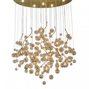 The Bubble Chandelier features different sized glass spheres suspended from a lit Brass color canopy. Contemporize a favorite retreat with the help of this stunning flush mount. Truly a stunning chandelier, this chandelier is sure to lend a special atmosphere anywhere it is placed.
