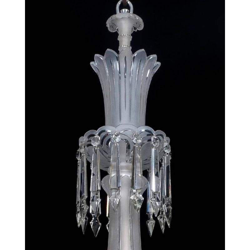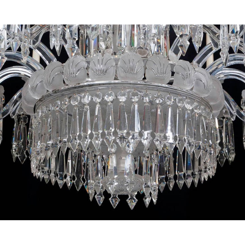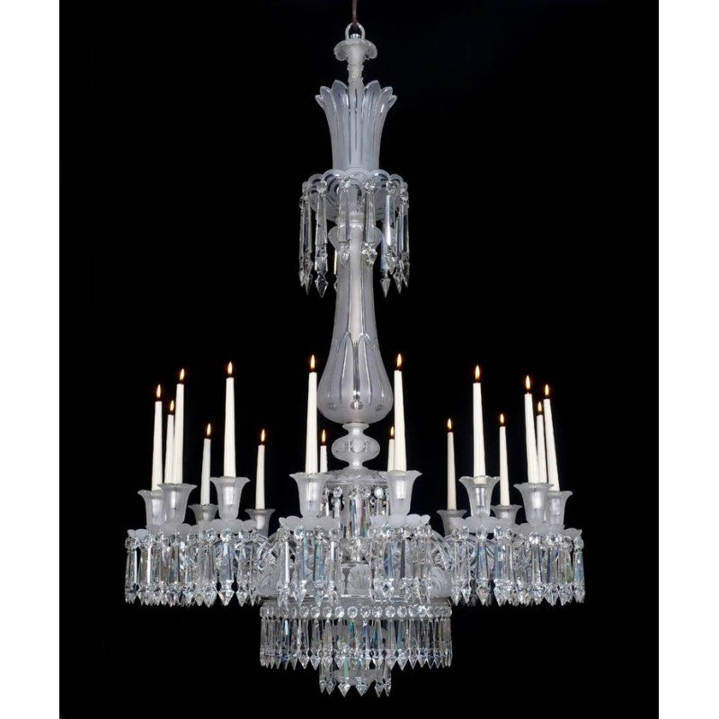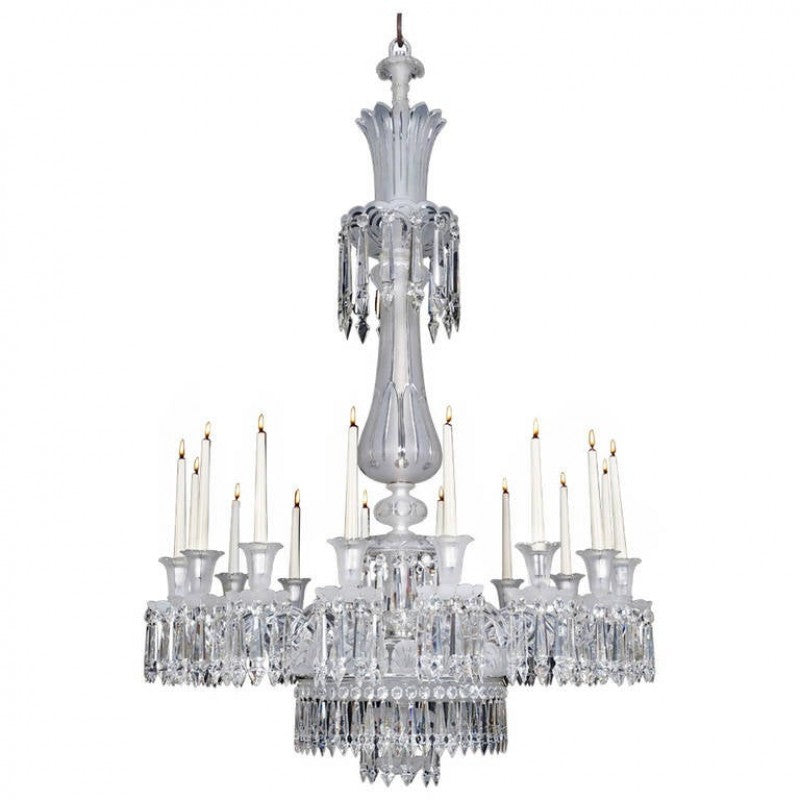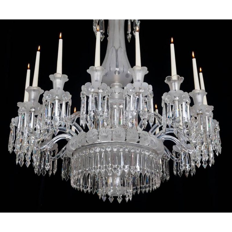 A fine quality mid-Victorian cut-glass silvered mounted sixteen-light chandelier the baluster stem with drop hung top canopy, terminating with a petal edged frosted glass crown, the mainframe surmounted by frosted glass shells, separated by sixteen leaf cut candle arms supporting petal edge nozzles and drip pans hung with pear-shaped drops and eight-sided spangles, the drop hung receiver bowl with lower canopy, also hung with spear drops terminating with finial.