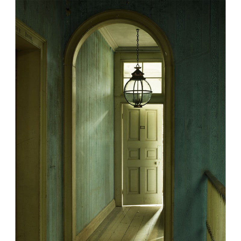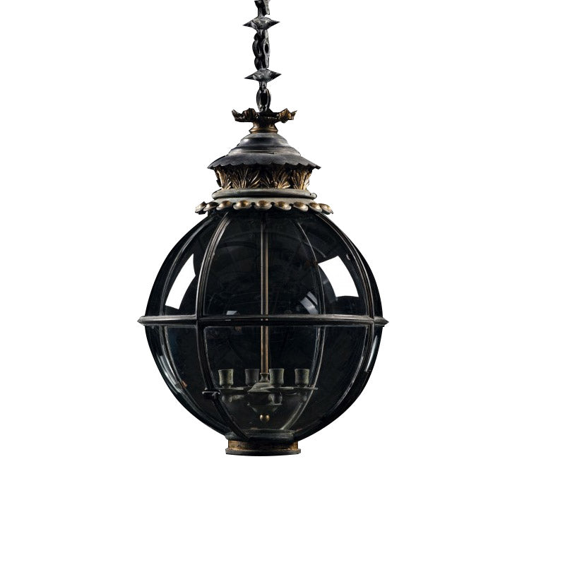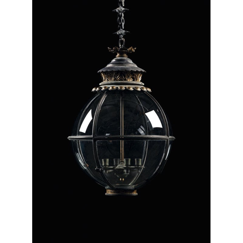 DESCRIPTION: A spherical hanging lantern with molded glazing bars and a hinged access panel, the top decorated with gilded foliage beneath a petal shaped smoke cap with foliate rose and a gilt bead collar.