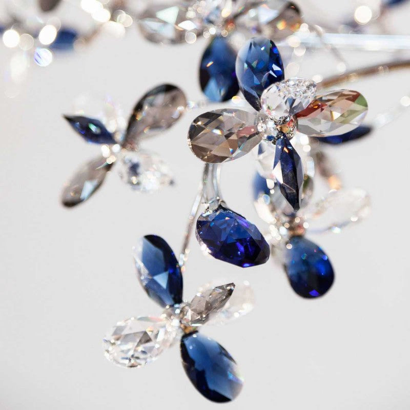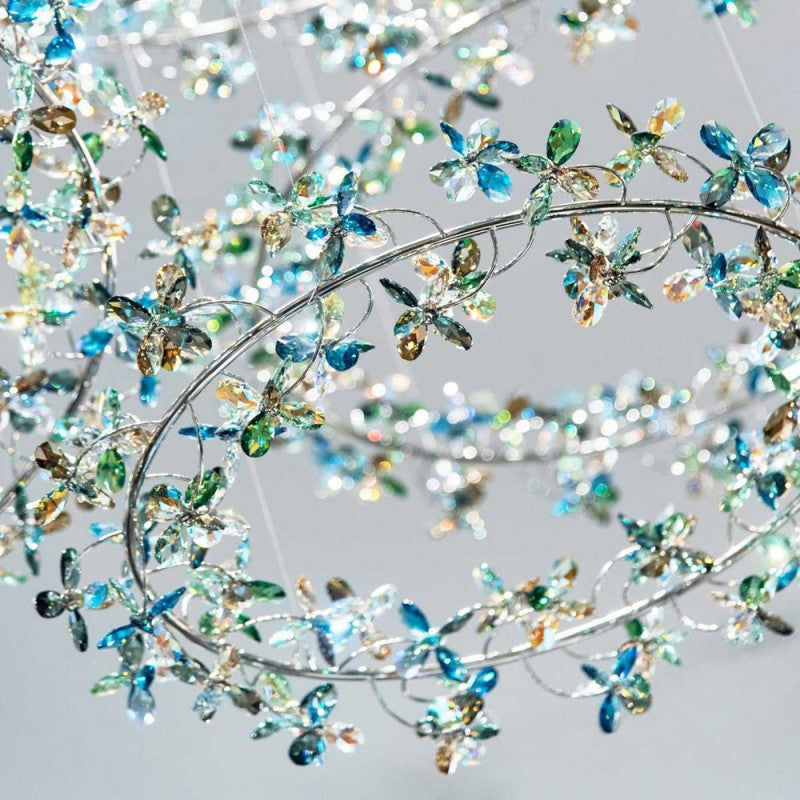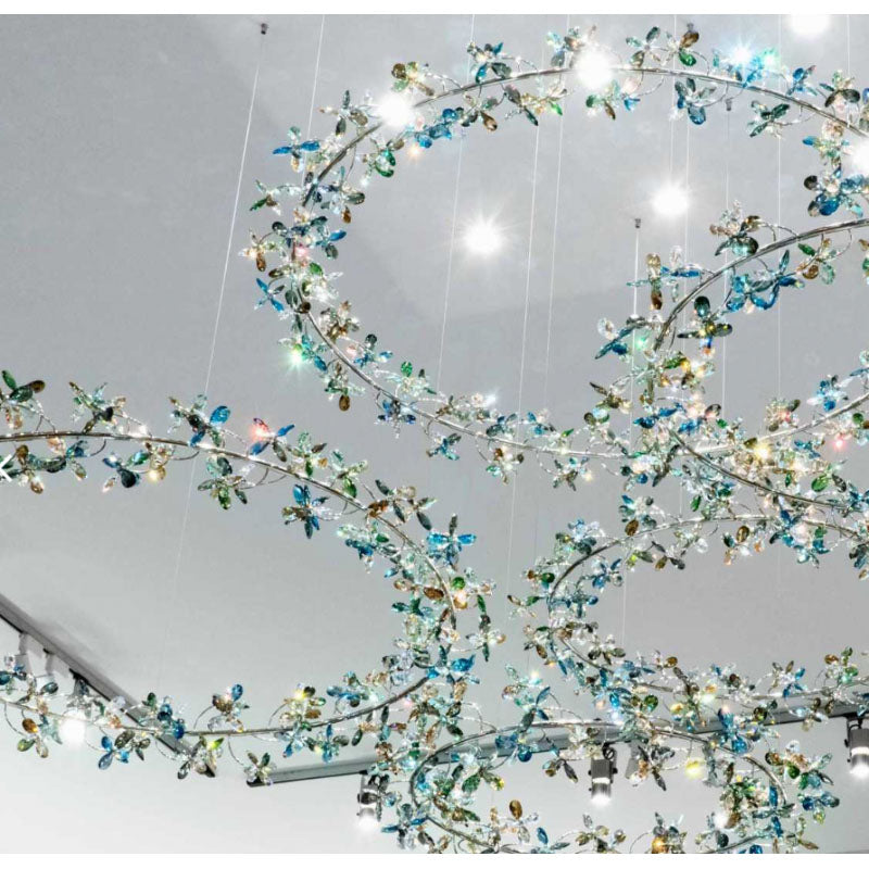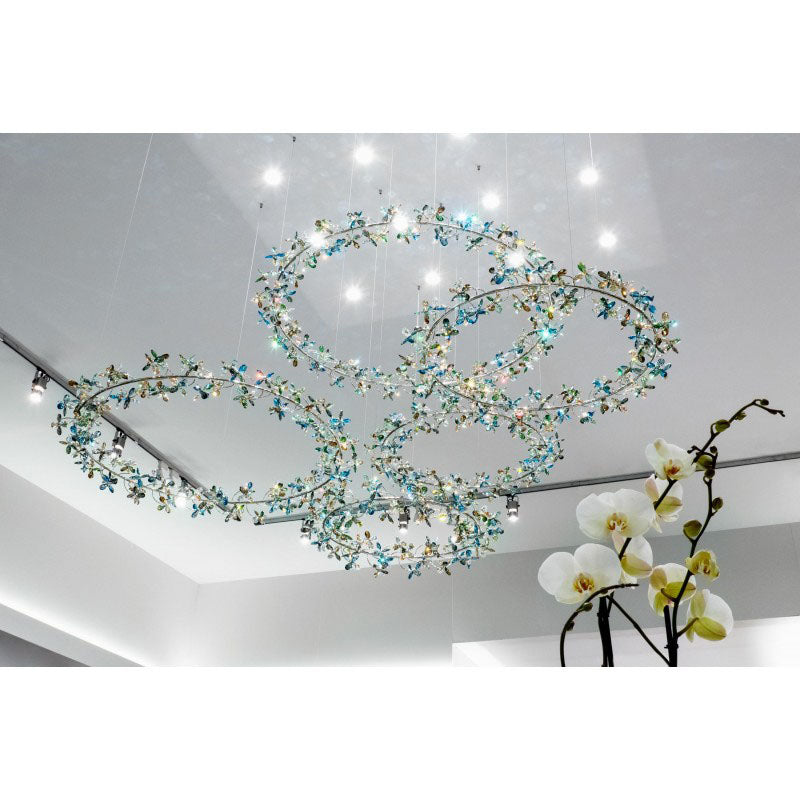 Effervescent and organic, the Eden collection consists of nature inspired, sculptural lighting that reinvents the look and feel of a traditional chandelier. Crown of flowers and leaves, evoking a visual celebration of the arrival of spring, enhanced by the crystals captivating beauty. Consisting of an interweaving circular metal branches supporting flower-shaped crystals. Endless variations ate possible through the customization of metal finishes; with the creative myriad of possibilities, each chandelier becomes a one-of-kind work that is as exquisite as the space it adorns.