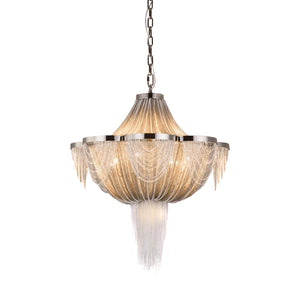 Empire Silver Chain Chandelier shown here composed of thin metal chains cascade down in polished nickel finish. This chandelier is part of a larger collection of luxury lighting including wall and ceiling lamps and various chandeliers in different sizes. A statement for any room, ideal for hallway or luxurious modern lounge setting. Made to a very high standard. Having created custom chandeliers for over three decades, we are specializes in bringing lighting concepts into reality, whether your inspiration comes from a rough sketch, an existing chandelier, our original concepts, or even your own creative imagination. Large or small, our team can meet the challenge, and can even coordinate the production of a private collection, where all finishes are kept consistent. Let us create the perfect lighting fixtures for your individual needs, to your individual specifications, and with attention to detail throughout production.