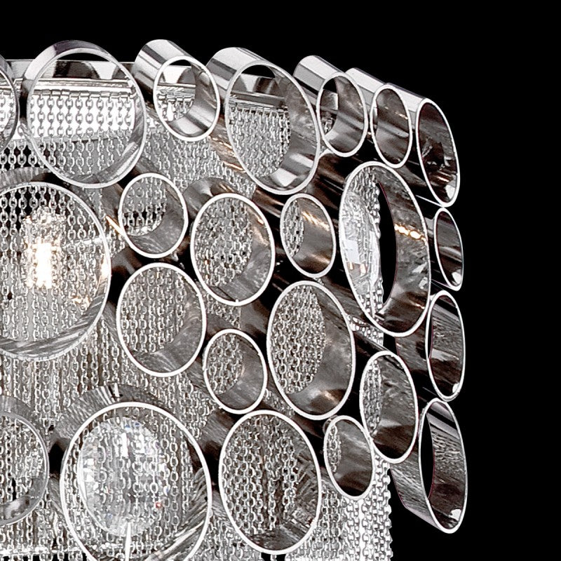 Meticulous attention to detail is displayed in the Cameo pendant light piece. Machined honeycomb rings are carefully positioned to create a perfect shelter for the metallic mesh draped chains. Incredible detail and craftsmanship allow this chandelier to be the highlight of any design. The Silver Chain Chandelier showed here composed of thin metal chains cascade down in polished nickel finish. This chandelier is part of a larger collection of luxury lighting including wall and ceiling lamps and various chandeliers in different sizes. A statement for any room, ideal for a hallway or luxurious modern lounge setting. Made to a very high standard. Let us create the perfect lighting fixtures for your individual needs, to your individual specifications, and with attention to detail throughout production.