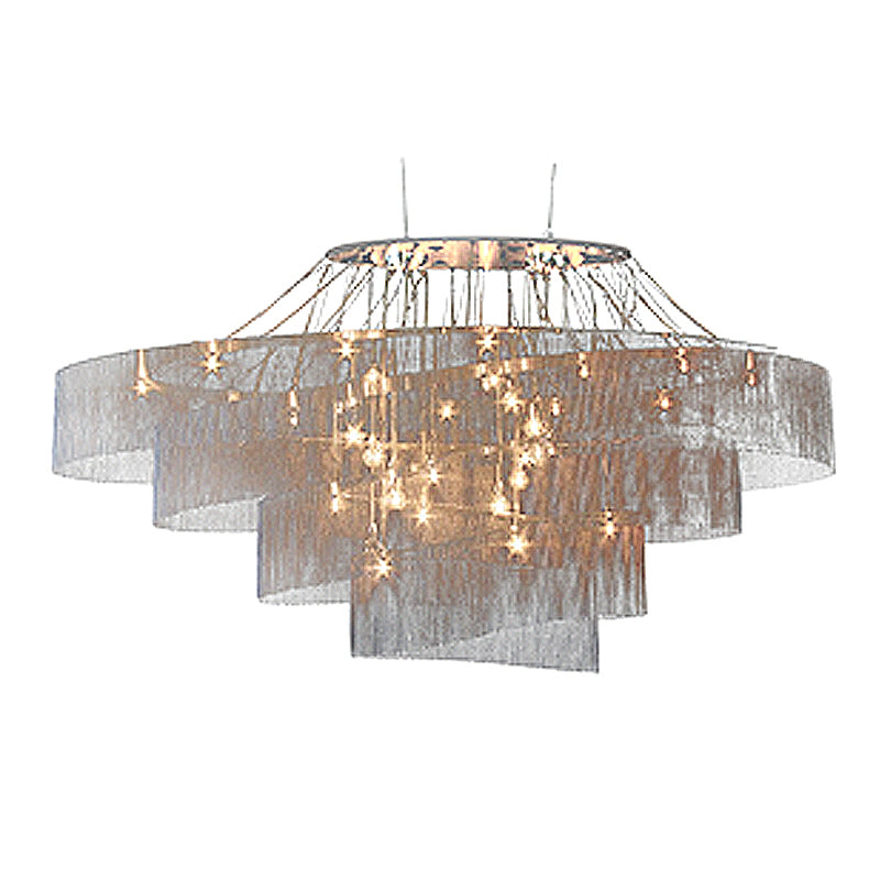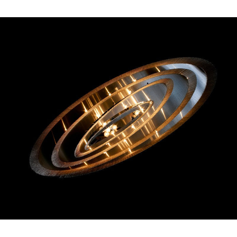 A spiraling elliptical shaped piece of art that is inspired by distant galaxies. The highly sculptural form of this chandelier has been described by some as "some sort of futuristic oceanic ship or an intergalactic pirate spaceship" It features two G4 Halogen electrical systems that can be controlled and dimmed separately giving the user a lot of control of how the chandelier appears. The elongated form of the chandelier lends itself to linear spaces making it an ideal centerpiece for a dining room or boardroom table.