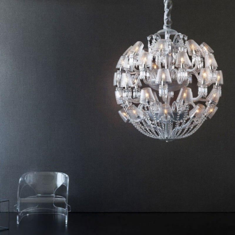 This majestic chandelier, a contemporary twist of the iconic Zenith chandelier, is revealed under a new light thanks to its current and timeless spherical figure. Cabled arms in the grand tradition of glass making and its round shape-cut curved crystal lampshades have been specifically conceived to draw a perfect spherical shape. Spiked prisms, festoons of octagons and scrolls come adorning this 40 L chandelier.  A red crystal octagon represents the Baccarat signature and is linked to a spiked prism signed by Marcel Wanders.