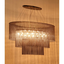 A suspended chandelier based on a modern classic chandelier design. An arrangement of three semitransparent elliptical volumes, made from laser cut stainless steel frames, chrome plated or lacquered. Composed of solid brass, illuminated by 18 surface mounted G9 Halogen or LED lamps.
