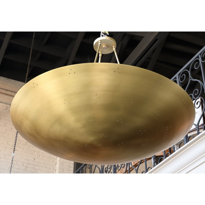 Custom conical / convex-shaped pendant chandelier in perforated brass. Can be done in different sizes and finishes. At Alan Mizrahi Lighting Design, we supply and manufacture many highly sought-after designer pieces. All Chandelier can be customized by number of lights, style, color and size to meet your specific needs. Every chandelier can also be combined with a matching table lamp and wall lamp to accomplish the best room design. Our company provides collections that can make all your project dreams come true. Lighting products play an important role in any room setting. Hence, you need to make sure that the items you choose should brighten the room while rendering it a relaxing and welcoming feel as well.